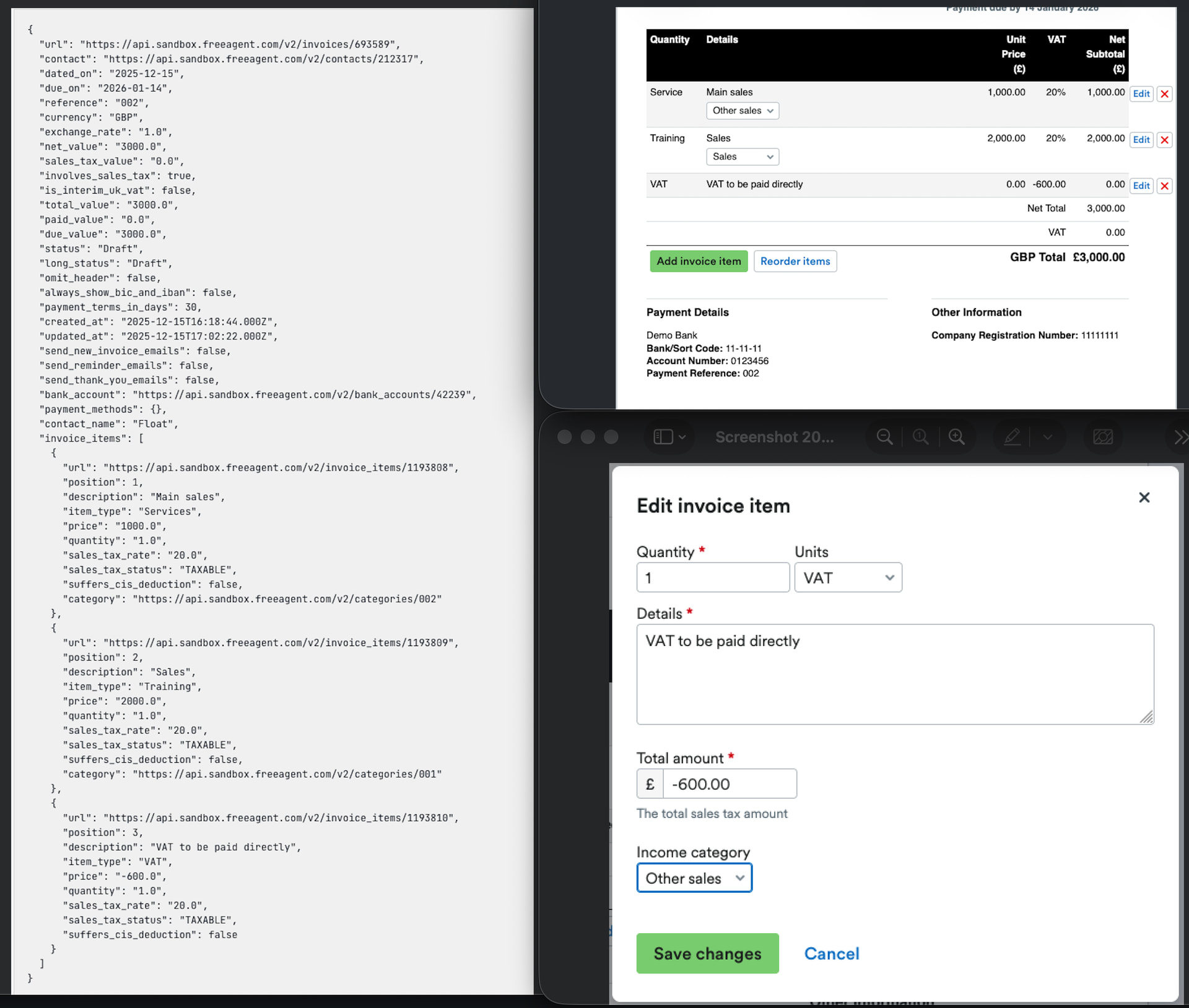 sales_tax_statusis returned asTAXABLEwithsales_tax_rate20.0. - This information does not match the data displayed on the invoice in the FreeAgent UI, and there is no way to edit these values within the UI. While we have a workaround that ignores the sales tax rate for these unit types, we wanted to flag this inconsistency.